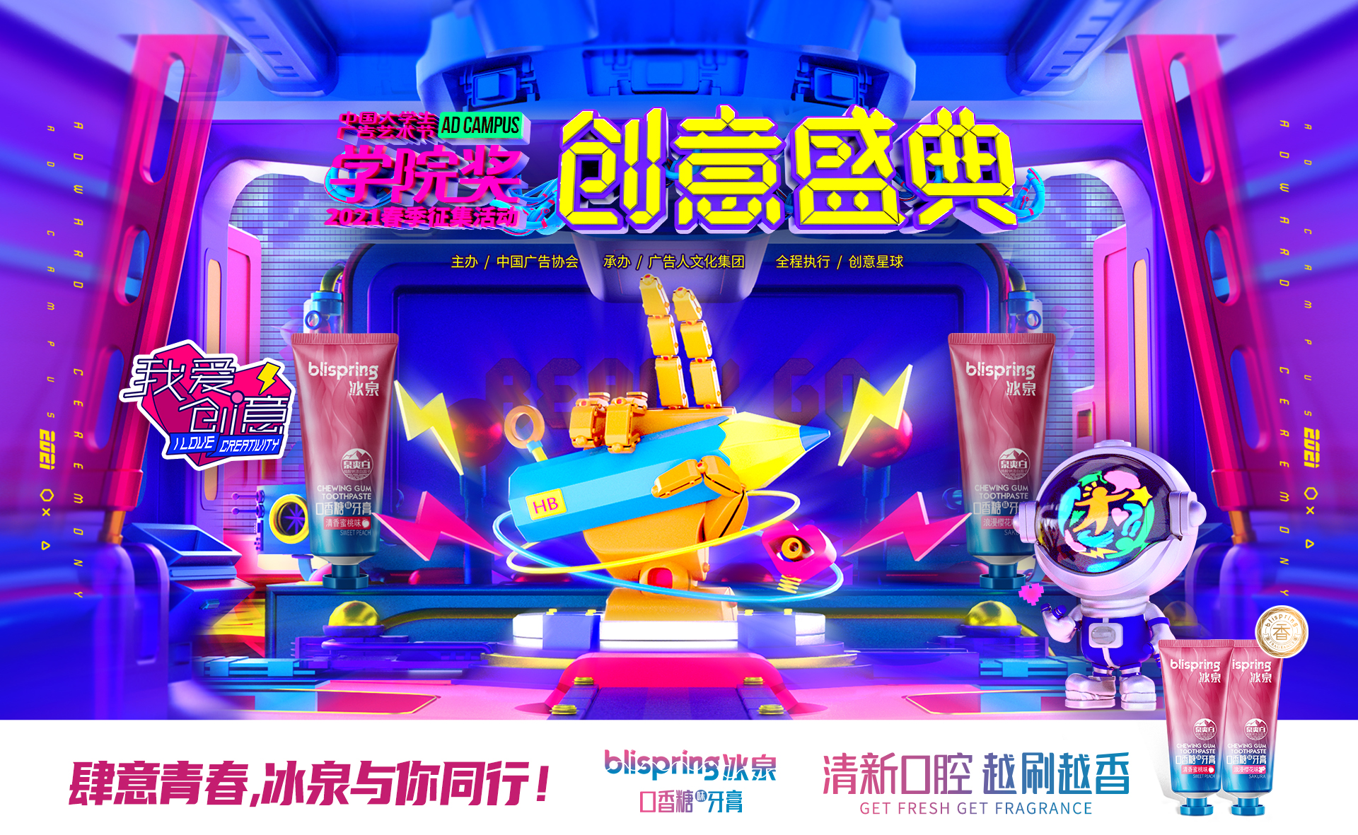 2021春季征集活动青年创意盛典在8月22日以网络直播的形式举行,冰泉与众多师生在云端相聚,为这一季的年轻创意加冕喝彩。