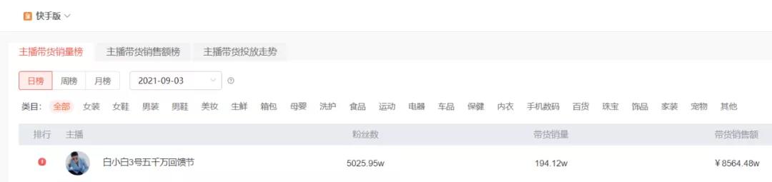 9月3日,实现带货销售额8000W+(数据源自红人点集)、登上当日快手主播带货榜首的网红歌手白小白,就可谓是非常抢眼的“黑马”主播。在这场业绩猛涨的直播中,同样出现了在各大平台头部、中腰部主播直播间热销的冰泉,以优异的表现,位列主播带货商品榜TOP5。