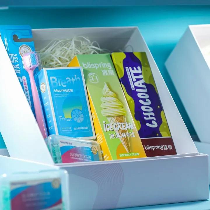 不止于牙膏品类,目前冰泉的产品矩阵已覆盖成人牙膏、儿童牙膏、漱口水、口喷、牙刷、电动牙刷、牙线、牙贴等品类。