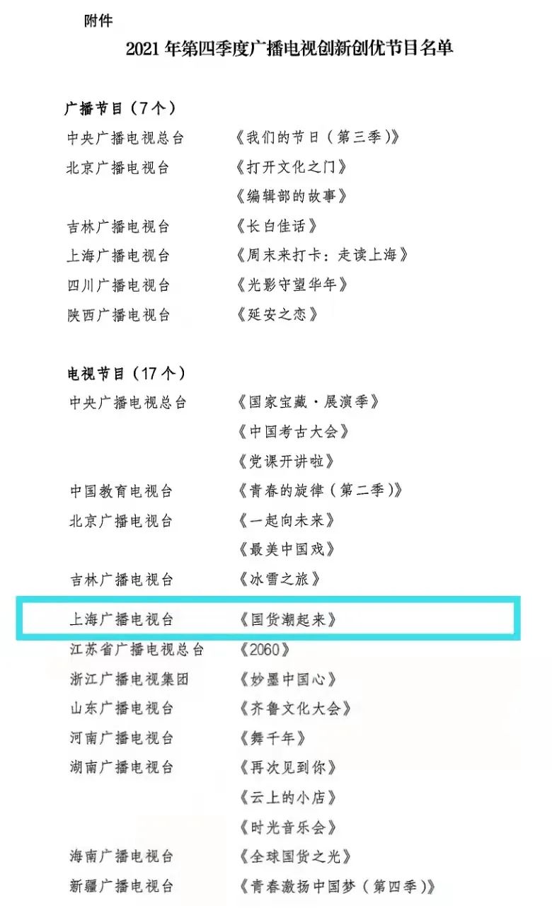 近日,经国家广播电视总局组织评选,确定冰泉独家冠名东方卫视王牌综艺《国货潮起来》为“2021年第四季度广播电视创新创优节目”,并给予表彰奖励!