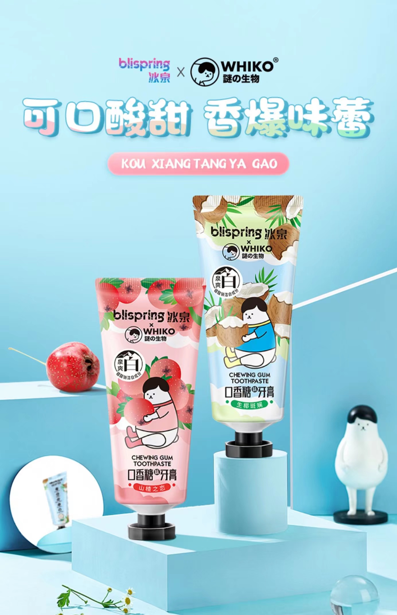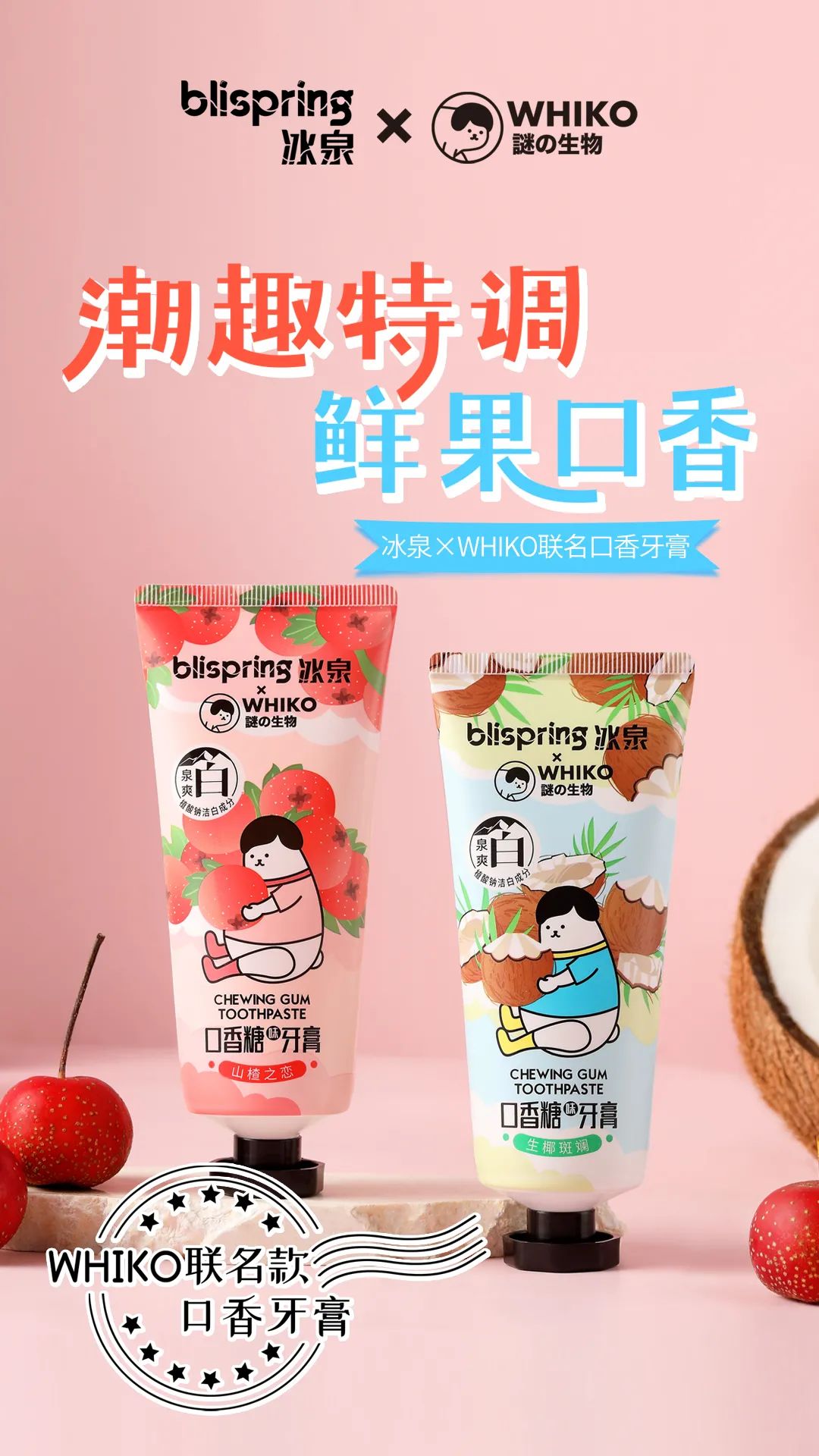带着满满期待,我们和WHIKO謎の生物联名推出了新款口香糖味牙膏,Double快乐泉力加载中.......
