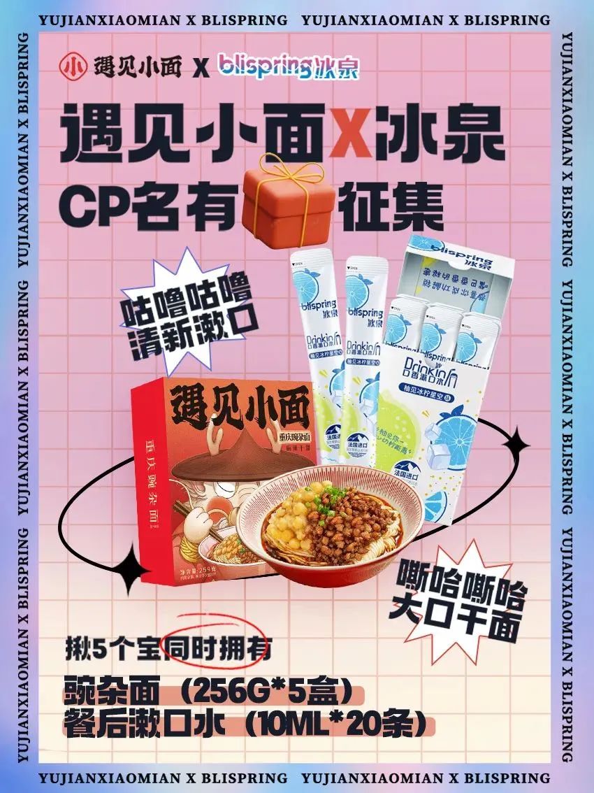 近日,冰泉牵手「遇见小面」官宣甜蜜撒糖,发起了CP名有礼征集活动,号召双方粉丝共同取CP名字,并送上心动口香美礼,点燃了粉丝们的热情。粉丝们一边感受面食的美味一边享受口腔的清新,还能大磕CP,脑洞频出的CP名字成功引发热议,趣味欢乐的联动又一次拉近了和消费者的距离,也为双方品牌带来了热度和流量。