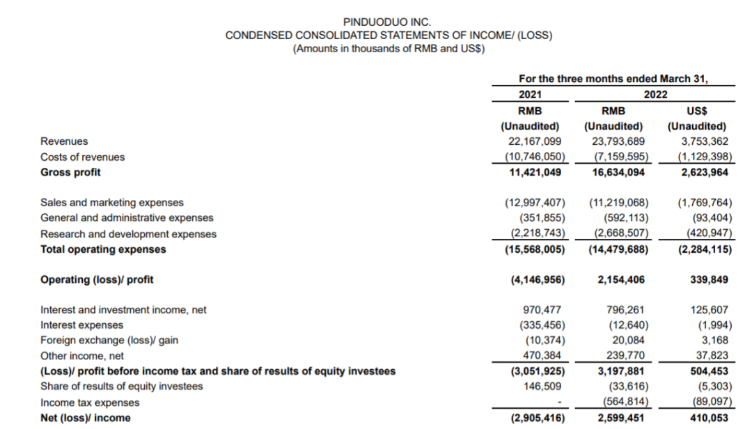 拼多多一季度实现营收237.94亿元,同比增长7%,超出市场预期;经营利润达21.54亿元,去年同期经营亏损41.47亿元;归属于普通股股东净利润达26亿元,去年同期净亏损29.05亿元。