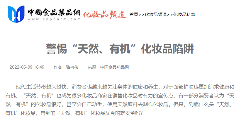 中国食品药品网发布名为《警惕“天然、有机”化妆品陷阱》的科普文、明确指出天然、有机并不代表着绝对安全,并对消费者自制化妆品的行为予以劝阻——看似天然安全,实则暗藏隐患。