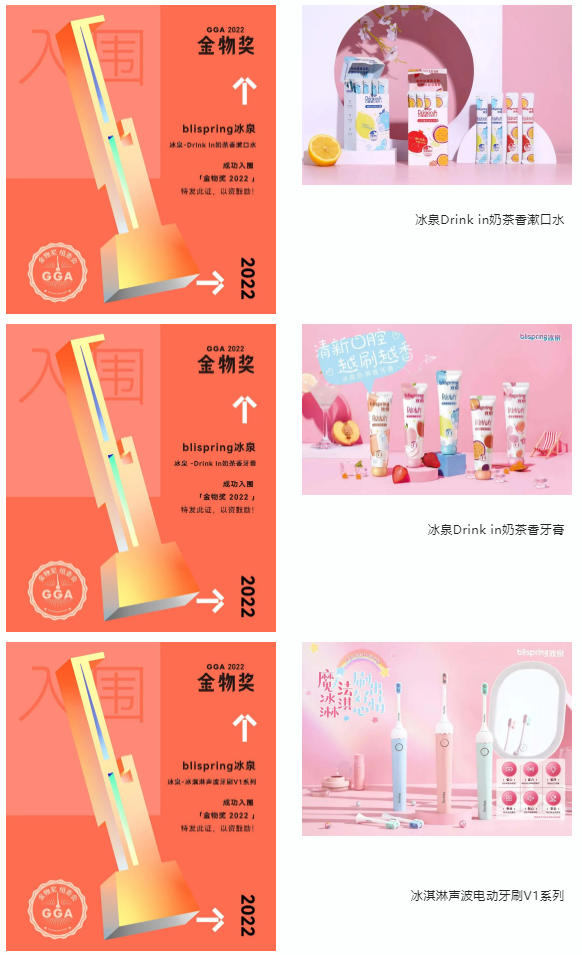 国货潮起来,喜讯不间断。近日,冰泉多款口香好物:冰泉Drink in奶茶香漱口水、冰泉Drink in奶茶香牙膏及冰泉冰淇淋声波电动牙刷V1系列好物凭借自身创新的产品力和优秀的品牌影响力均成功入围金物奖2022(第三届)!